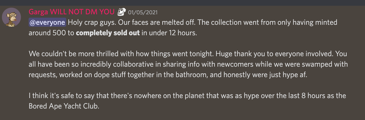 The remaining Bored Apes (9,500 or so) were minted in one insane night. The collection sold out in the early morning of May 1st 2021. That night, BAYC was the most-used smart contract on the Ethereum network, flipping UniSwap. 🥳