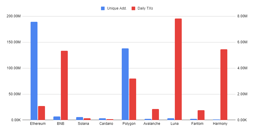 Comparing these numbers to other chains we can see that Harmony is a little behind but not by much with some of the largest chains like BNB, and Luna.