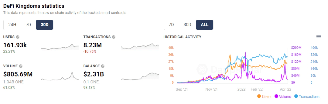 33/45 TVL tells a similar story having run up impressively in the initial period it has since stalled a bit hovering around the 3b ONE mark in TVL defillama.com/protocol/defi-kingdoms/all/ONE