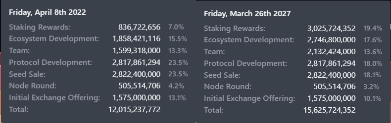 10/45 Tokenomics (Supply): Looking at the composition of the supply as of today vs in 4 years time we can see that we still have a large amount of staking rewards to be released (~2.2m $ONE), as well as around 1m for the ecosystem development and a smaller amount for the team.