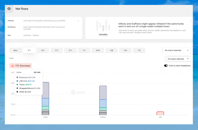 • Net flows which can be filtered by chain/asses/timeframe