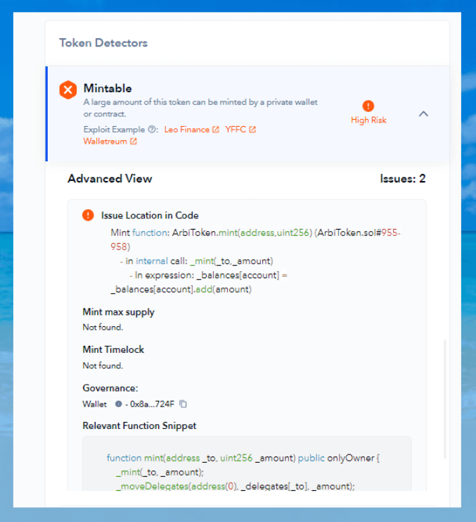 Under Mintable Risk, a feature called "Timelock" and "Mint max supply" wasn't present.