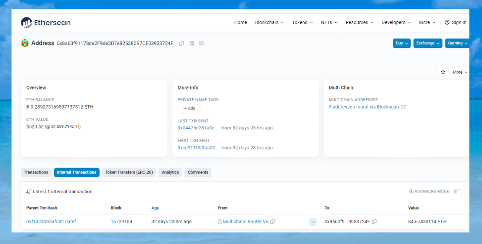 In the end, 84ETH (~$150K) was rugged and bridged to mainnet via Multichain.