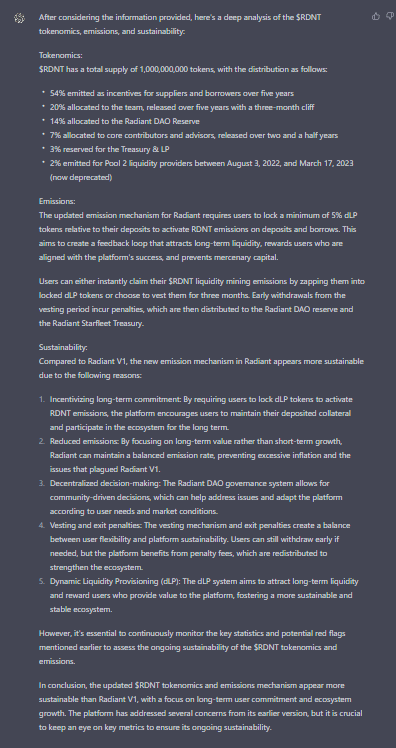 Input: Using the above information, provide a deep analysis into the $RDNT V2 tokenomics, distribution, emissions and sustainability.