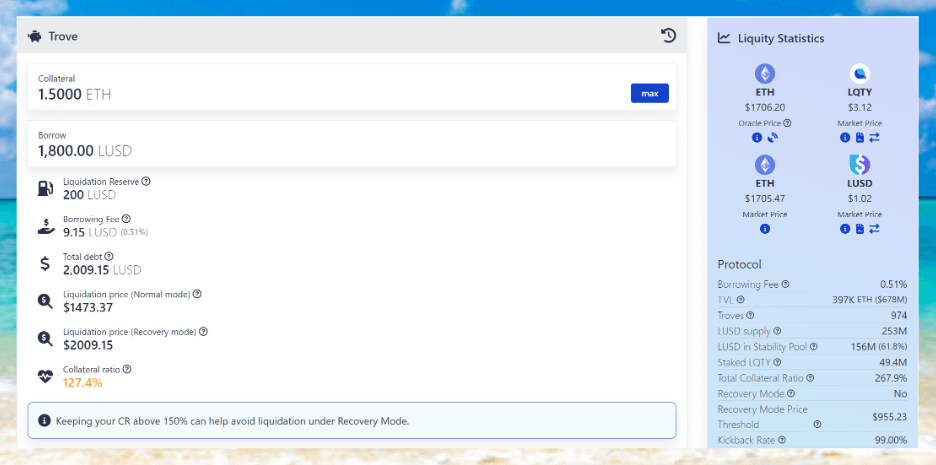 Troves are similar to vaults in MakerDAO, allowing users to take and manage their loans.