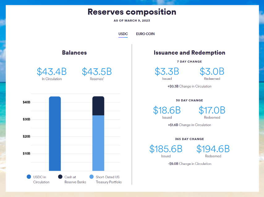 Cash reserves were held at BNY Mellon ($5.4B), SVB ($3.3B), Signature Bank (for minting/redemption) and Customers Bank ($1B).