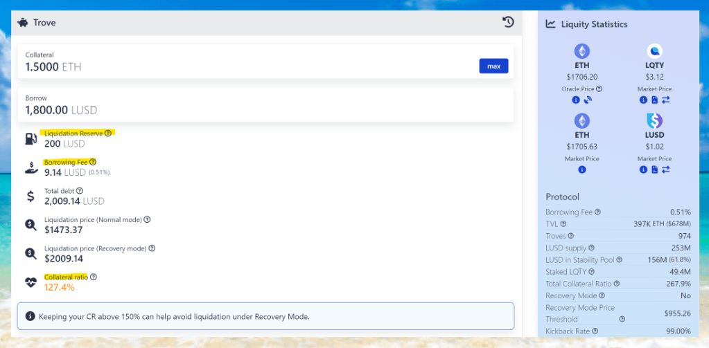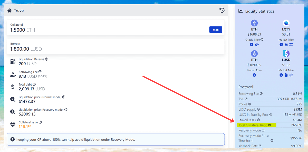 - Min. Collateral ratio is 110% (150% on Recovery Mode)