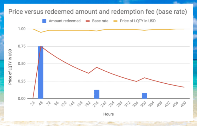 A base rate formula determines the redemption fee, which starts at 0% and increases with every redemption, decaying to 0% if no redemptions occur.