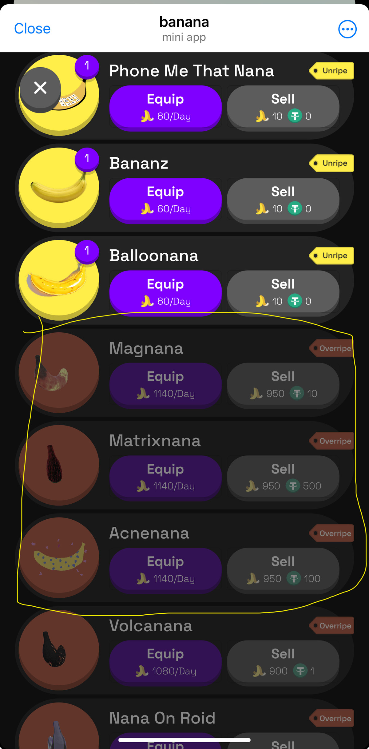 Equip the highest-level bananas you harvested. For example, I equipped a banana with 720 peels/day.