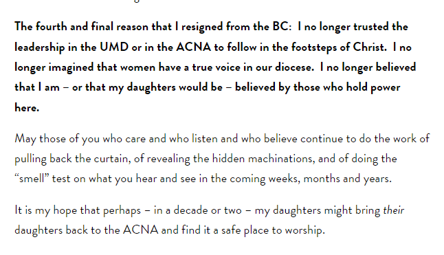 Concurrently, Helen Keuning, a longtime @the_ACNA parishioner and member of the @MidwestAnglican Bishop’s Council, began to identify patterns that revealed the UMD's continued choice to prioritize institutional power over survivors. On 3/18/22, she too would resign her position.