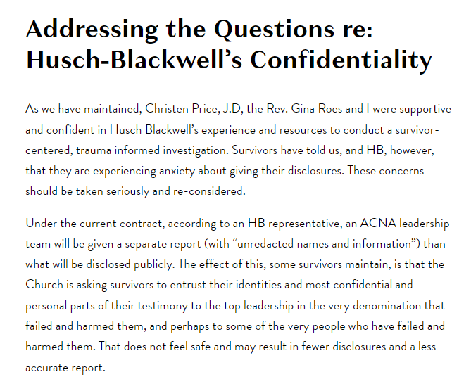 Despite survivor calls for a thorough investigation, @The_ACNA limited the scope of what @HuschBlackwell could investigate and specifically prohibited them from analyzing or evaluating the data they collected.