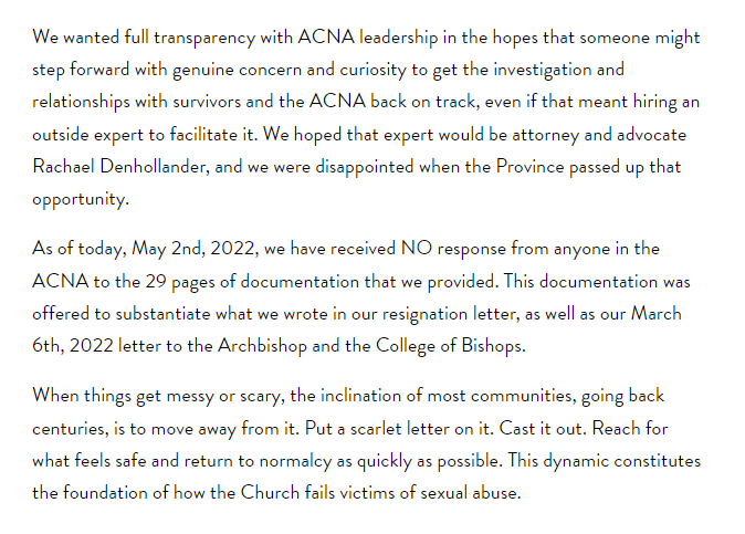 Our conversations with numerous survivors have made it clear to us that abuse and mishandling are pervasive ongoing problems within @the_ACNA, and that the Province and many diocesan leaders remain unmotivated to acknowledge or reckon with this cancer in their denomination.