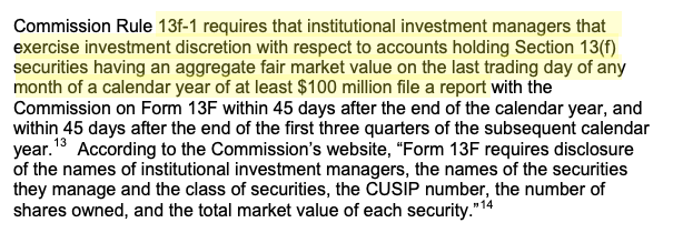 La SEC obliga a publicar el 13-F cada trimestre a todo fondo con +$100 millones de activos bajo gestión.