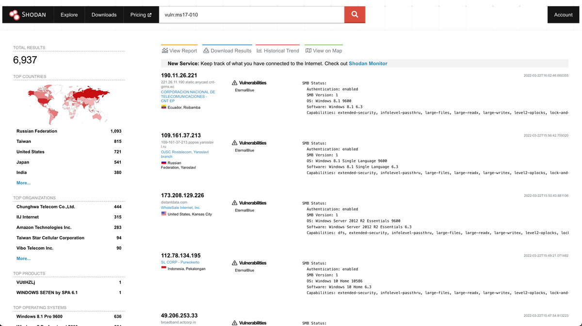 ex - Search all machines vulnerable to 'eternal blue'. vuln:ms17-010