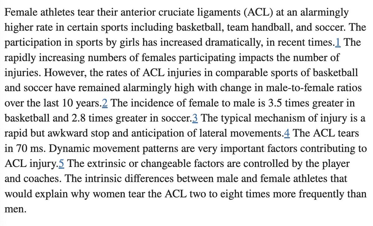 Female biomechanics lead to a higher risk of injury to the anterior cruciate ligament, something I was alerted to by "Lia", a 15-year-old state-level soccer player. (Pseudonym because anyone speaking out risks ugly harassment & threats.)