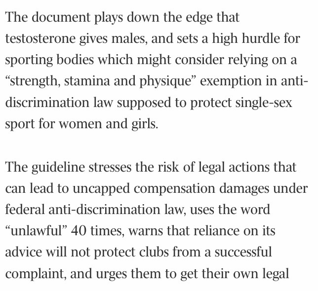 In theory, sports might try to stay female-only by using an exemption in discrimination law where sex differences in "strength, stamina and physique" tilt the playing field. But the government guideline makes this look highly uncertain & warns sports to get legal advice.