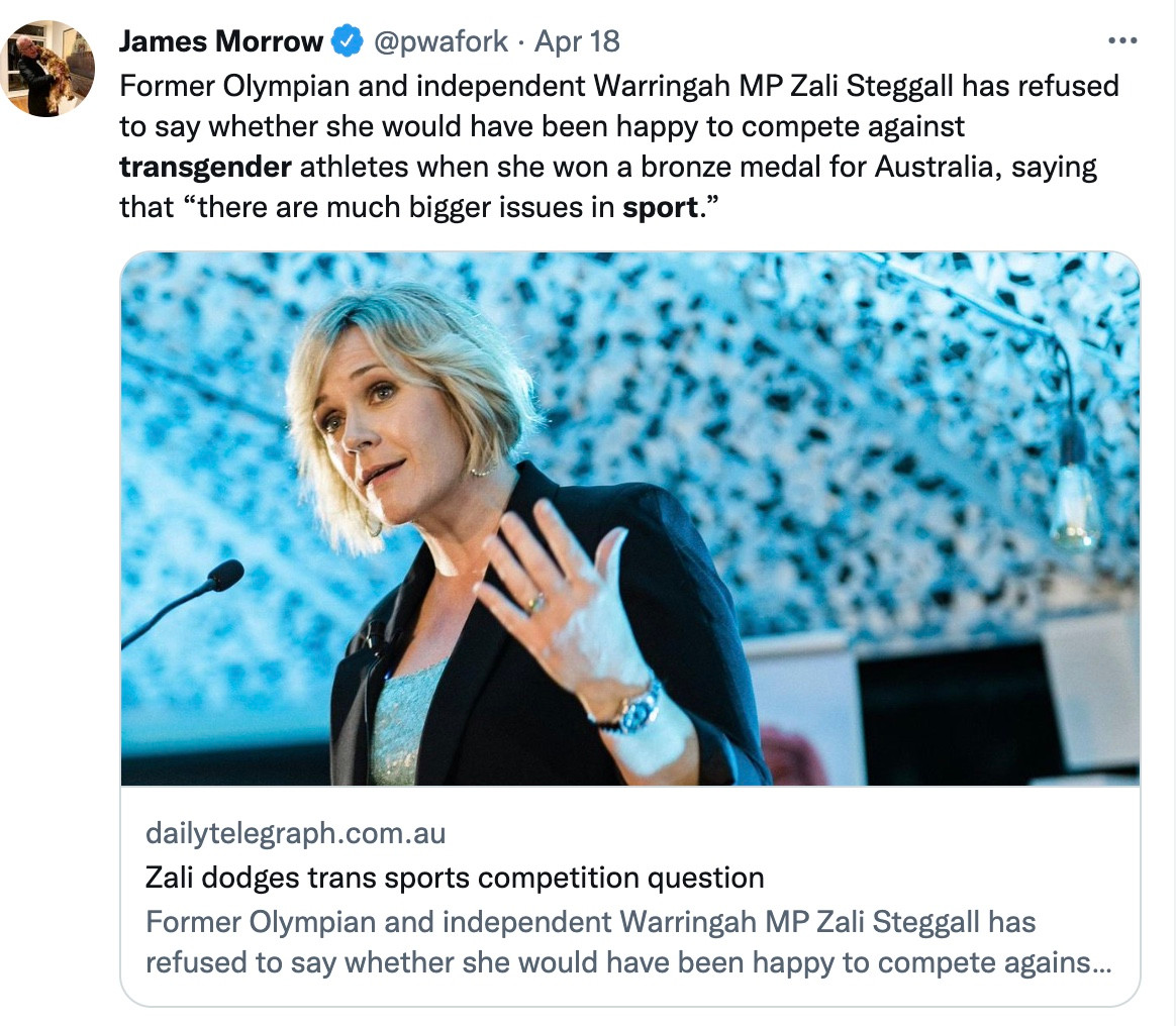As for Zali Steggall, she was asked this week by The Daily Telegraph if she would have been happy to compete against a male-bodied trans woman back in her Winter Olympics days. She reportedly refused to be drawn on her own experience in sport.