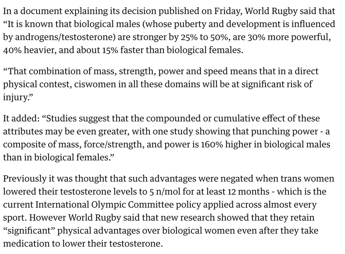 Research also concluded that trans players who go through male puberty lose little of their physical advantage after 12 months on drugs to lower their testosterone in line with 2015 International Olympic Committee rules (which seemed plucked from the air).