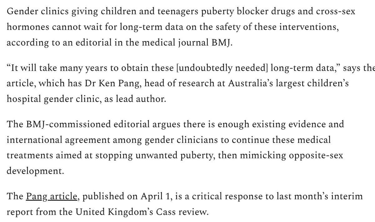 That decision not to endorse puberty blockers or hormones for minors came under criticism from researchers linked to Australia's biggest gender clinic at the Royal Children's Hospital Melbourne (RCH).