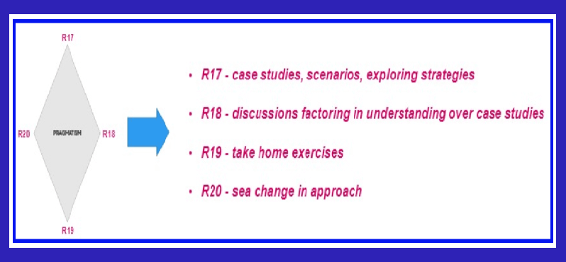 5. PRAMATISM (R17 - R20) The final step could be thought of as a resultant / output when the previous 4 steps could be the input. To help aspirants build a pragmatic approach one could think of: • numerous case studies, scenarios deep-diving into strategies 16/