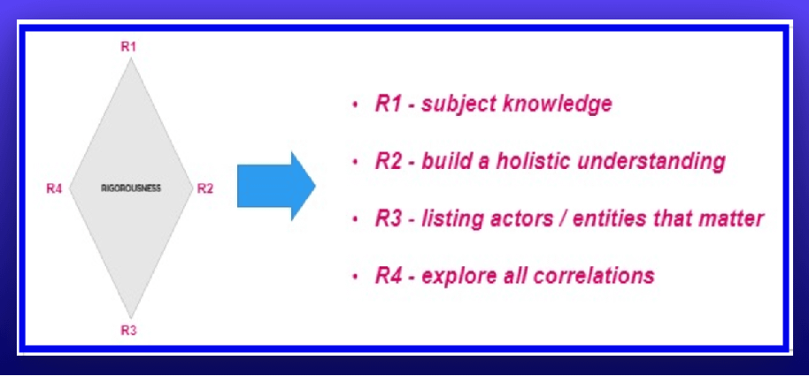 The understanding built there over the subject ought to translate into a degree of familiarity & fluency over: • listing out all actors so as to define boundaries / scope & • clearly depict correlations / idiosyncrasies that persist between those actors 8/