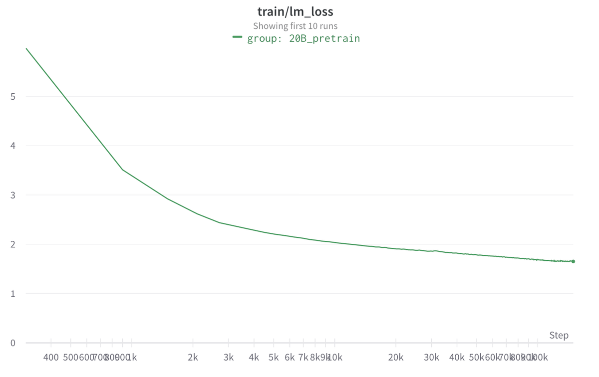 When looking at OpenAI's plot, it's easy to assume that it represents the training curve of large models. But 10^9 is "only" 1B: my model is 20B params and was trained for 400B tokens. The burn-in period ends at around the 20M token mark (4/12)