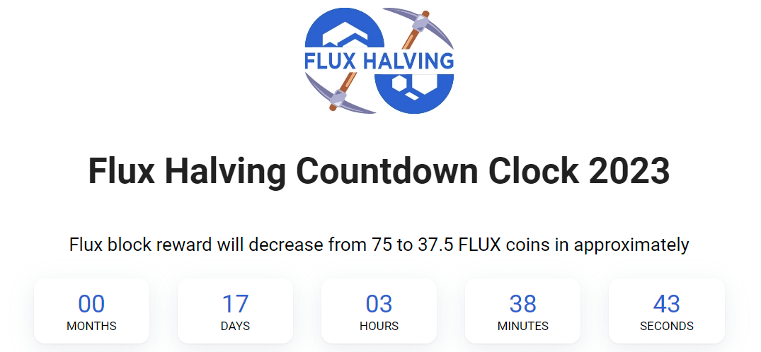 The next Flux halving is approximately on February 5, 2023 and Flux block reward will decrease to 37.5 FLUX coin per block.