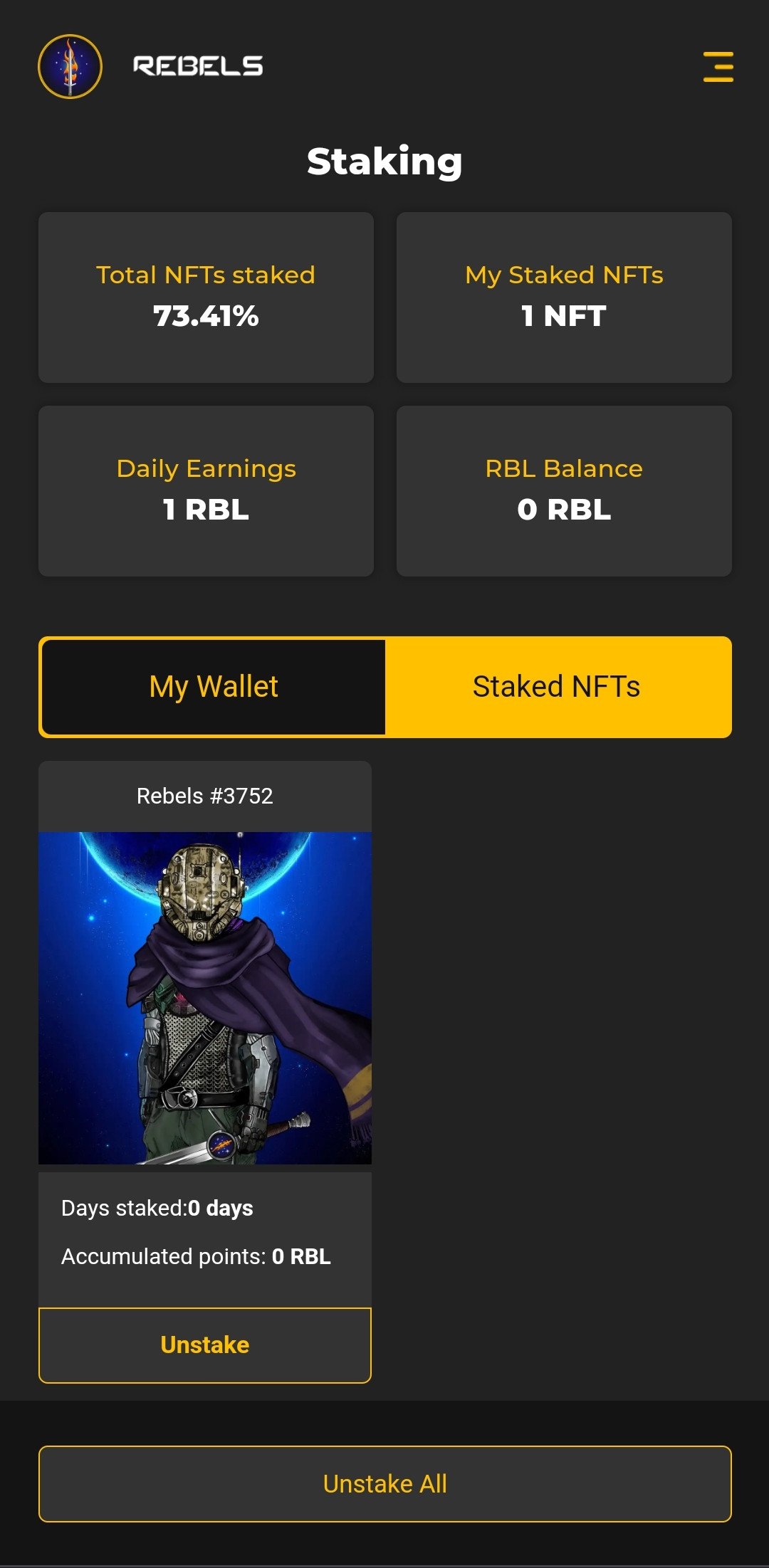 The Rebels staking platform is easy to use and mobile friendly. The staked NFTs earn the $RBL token daily which can be used in the Rebels market place.