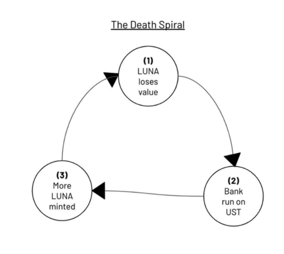 Imagine a bear market, where the LUNA token’s value falls → With that, UST Holders could fear a peg break and sell their UST for LUNA → This will then increase the supply of LUNA, which further decreases its price and continues this vicious cycle (hence the death spiral).