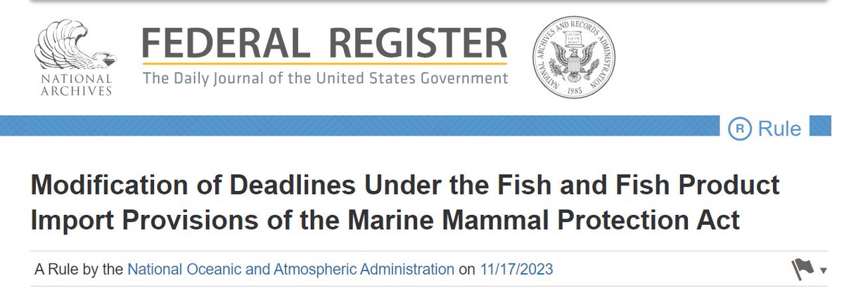 2/5 Until then seafood comes in regardless of harvest impact on marine mammals. Comparability findings to be published annually in Fed Reg. IRONIC that so far comp fdgs 👍granted only for some fisheries in 2 countries - Mex & NZ - yet all now prohibited👎 & no exemption for them!
