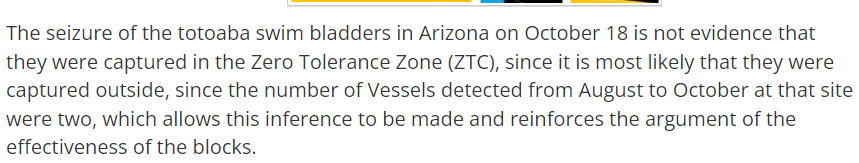 3/3 #Totoaba will be arrive back soon on their seasonal migration. Fishing activity rises from summer lull starting mid-October, & actually the next day after your Oct 15 cut-off date @SeaShepherdSSCS visually confirmed 3 boats shrimping with illegal gillnets in the ZTA.