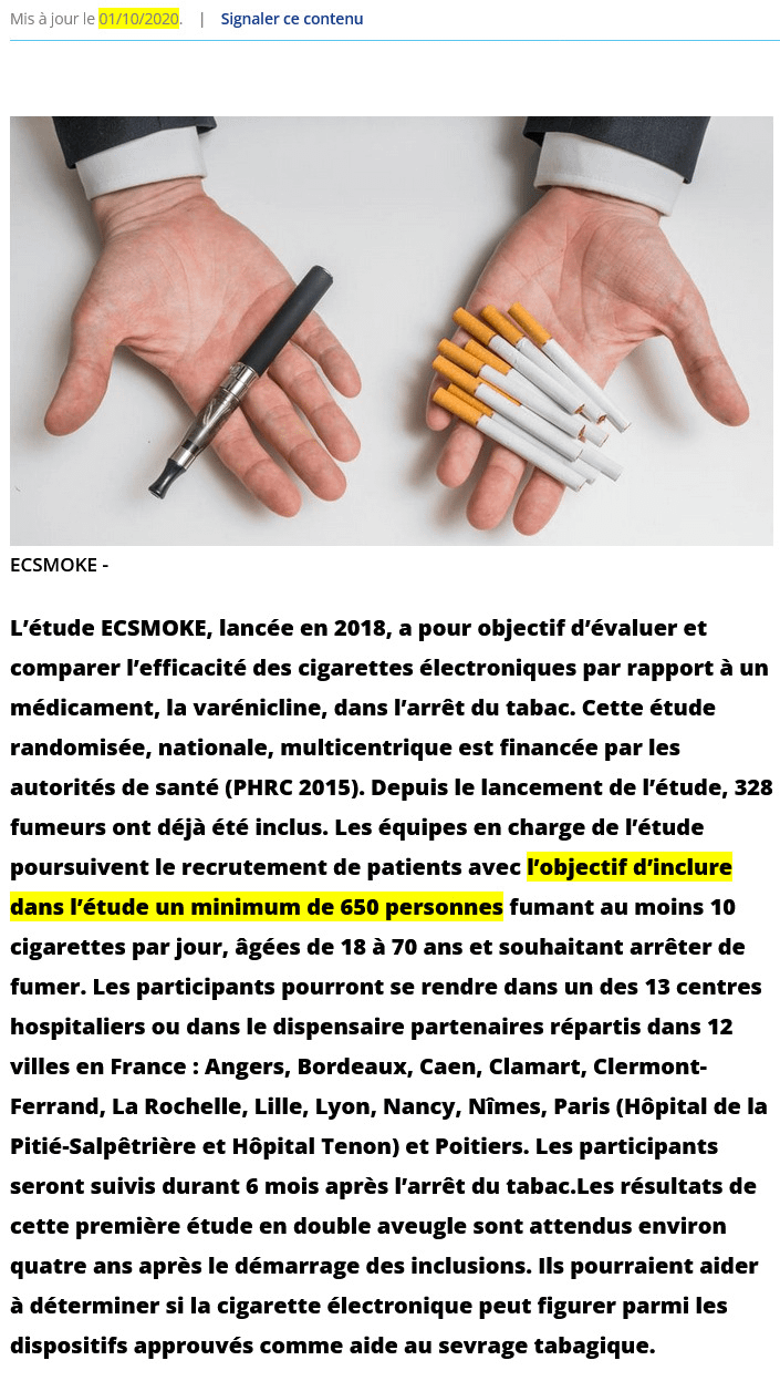 Prenons l'exemple de la l'étude ECSMOKE pour comparer l'efficacité de la e-cigarette vs médicaments pour arrêter de fumer (me demandez pas comment ils vont faire le double-aveugle), lancée en 2018. 2 ans plus tard, fin 2020, ils recrutaient encore ! ⤵️