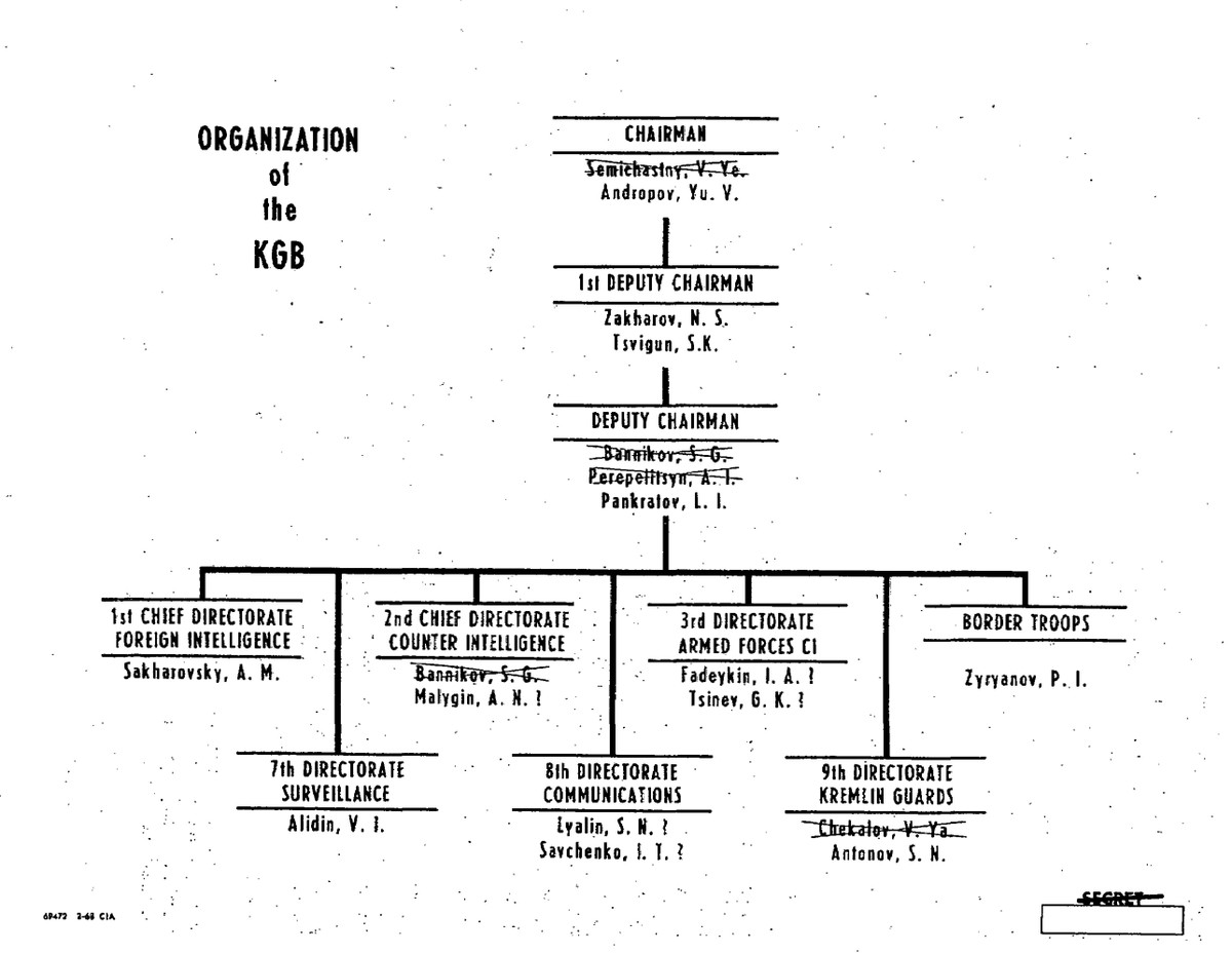For example, 2nd Chief Directorate (SCD) chief Bannikov was not replaced by Malygin (who was in charge of another KGB department), but by Tsinyov.