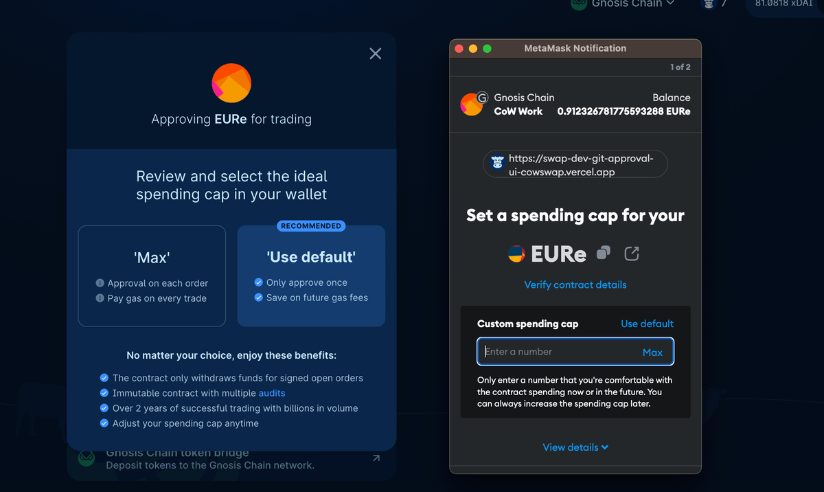 Starting today, CoW Swap users will see a new modal when they approve the CoW Protocol settlement contact, encouraging them to set infinite approvals for token swaps with CoW Swap.