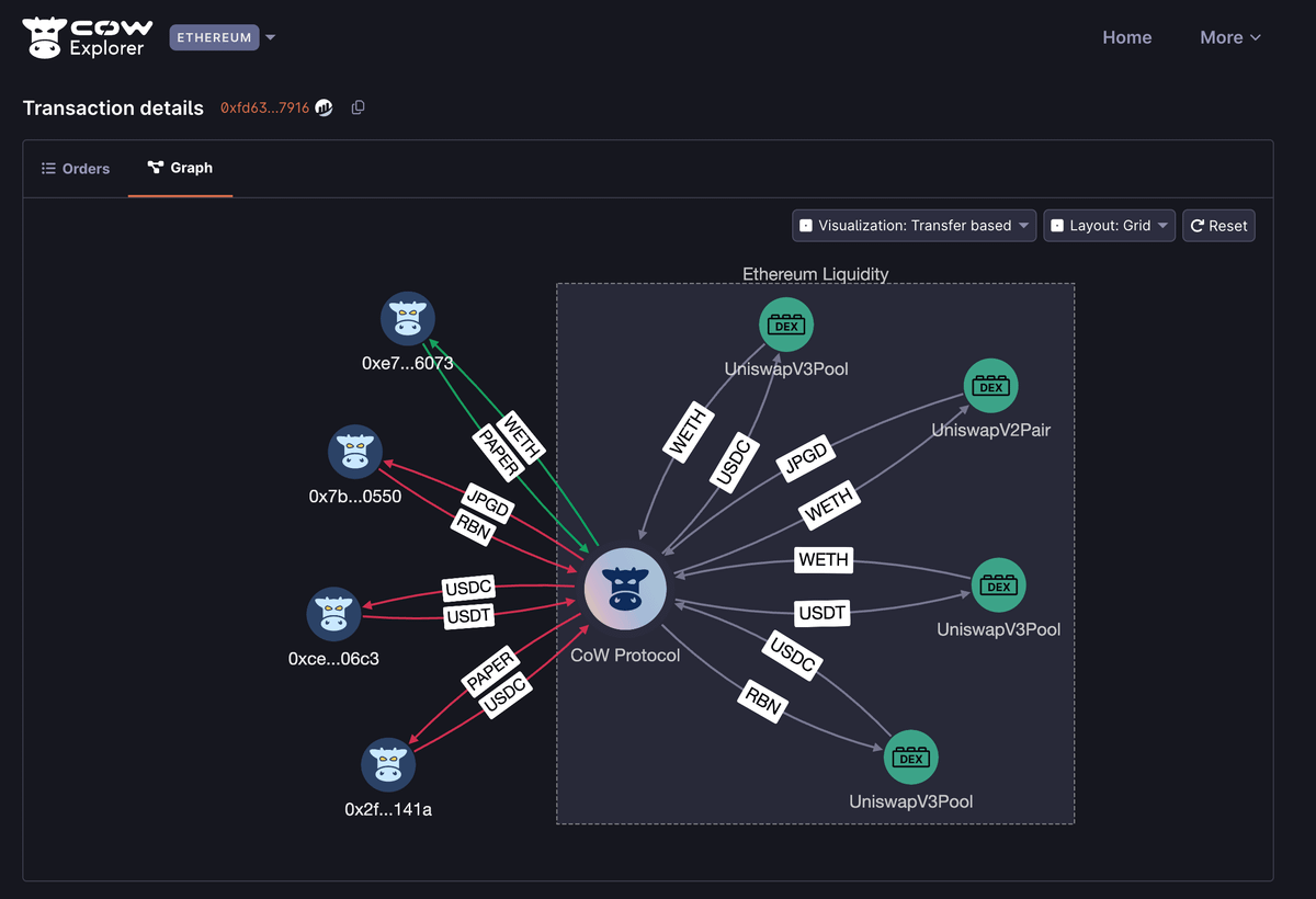As you can see in the CoW Explorer, the majority of the order liquidity came from peer-to-peer swaps, with some touching onchain AMMs as well.
