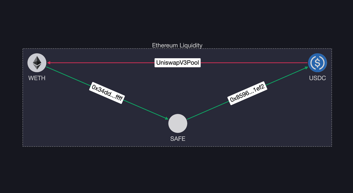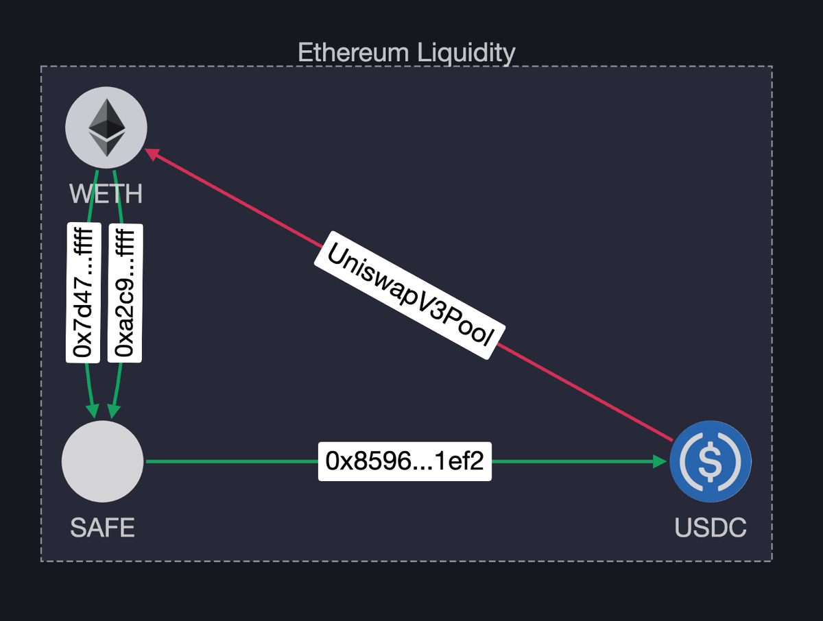 The user buying $SAFE was matched with the user selling $SAFE, and the CoW Protocol settlement contract tapped Uniswap v3 to transfer $ETH to $USDC – effectively filling the 3rd side of a ring trade.
