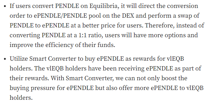 $PENDLE holders have the option to convert their tokens into $ePENDLE and then stake them, enabling them to earn rewards in both $PENDLE and $EQB.