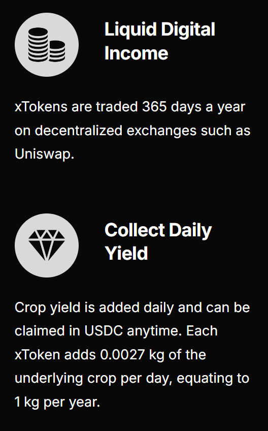 1 xWHEAT can be staked to earn 1 cWHEAT per year, which can then be exchanged for USDC at market value of 1kg of wheat.