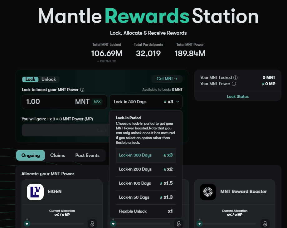 Example: Locking $MNT for 300 days increases your MP by 10x, significantly boosting your share of rewards. This compounding effect makes long-term staking very lucrative.