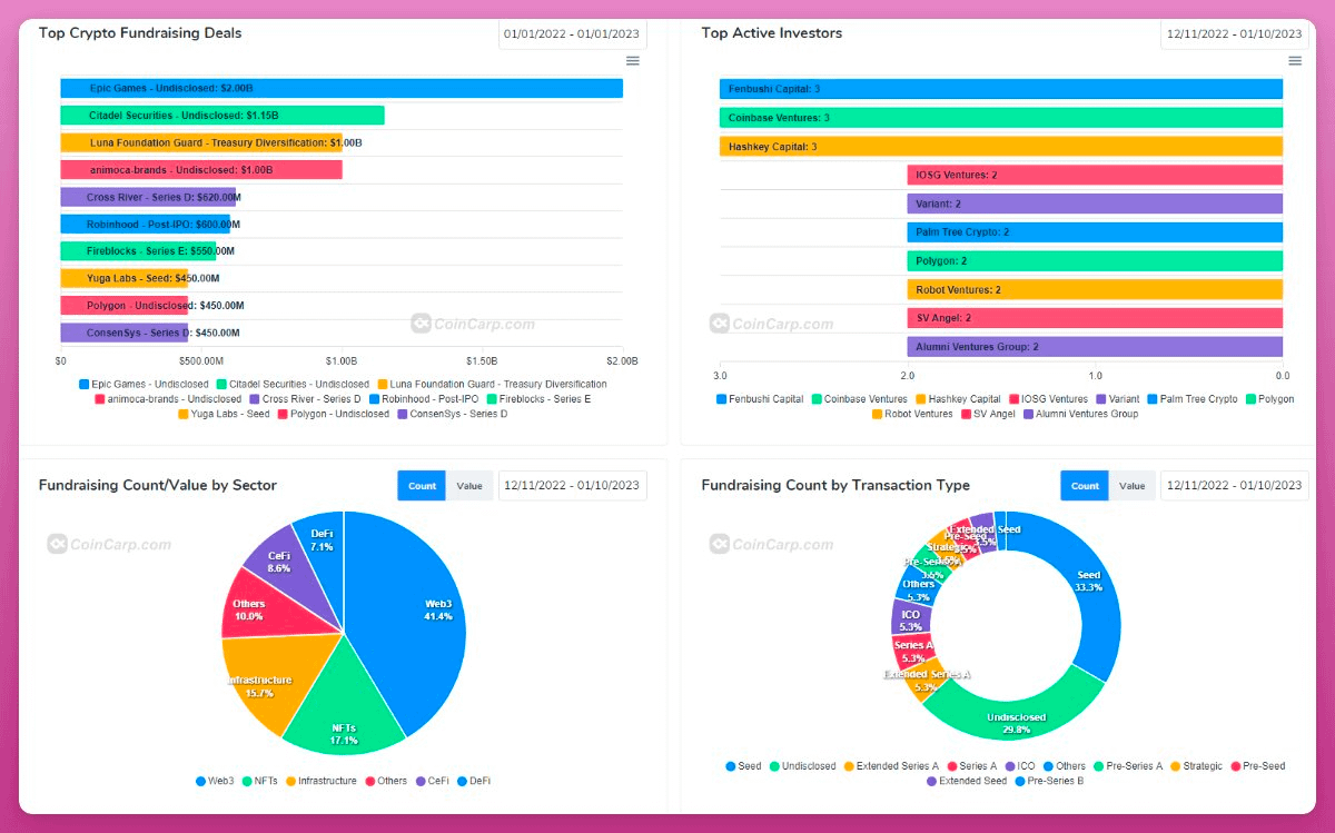 依照階段、金額或是趨勢排序,查看加密貨幣的融資情形