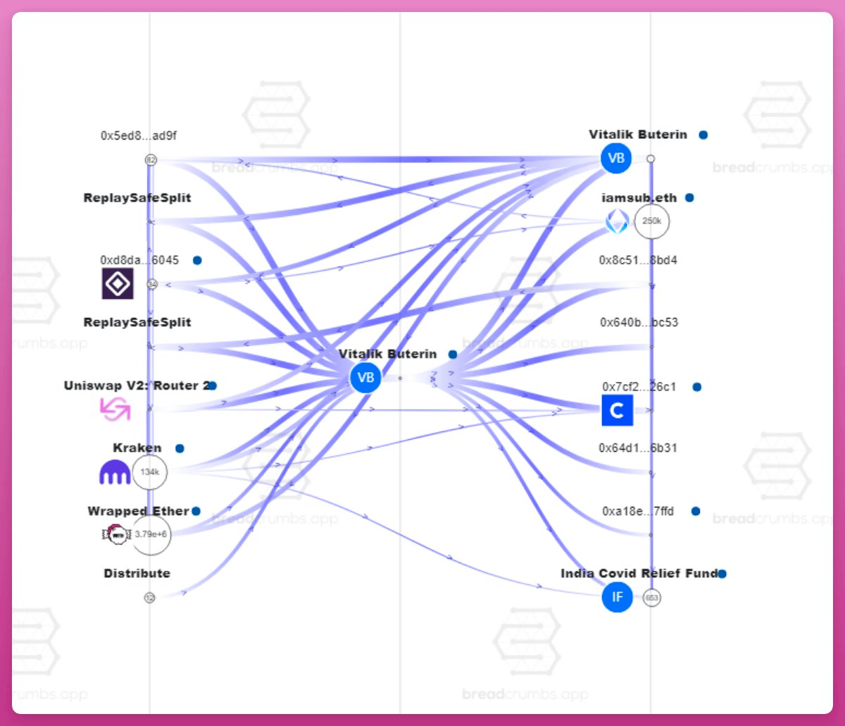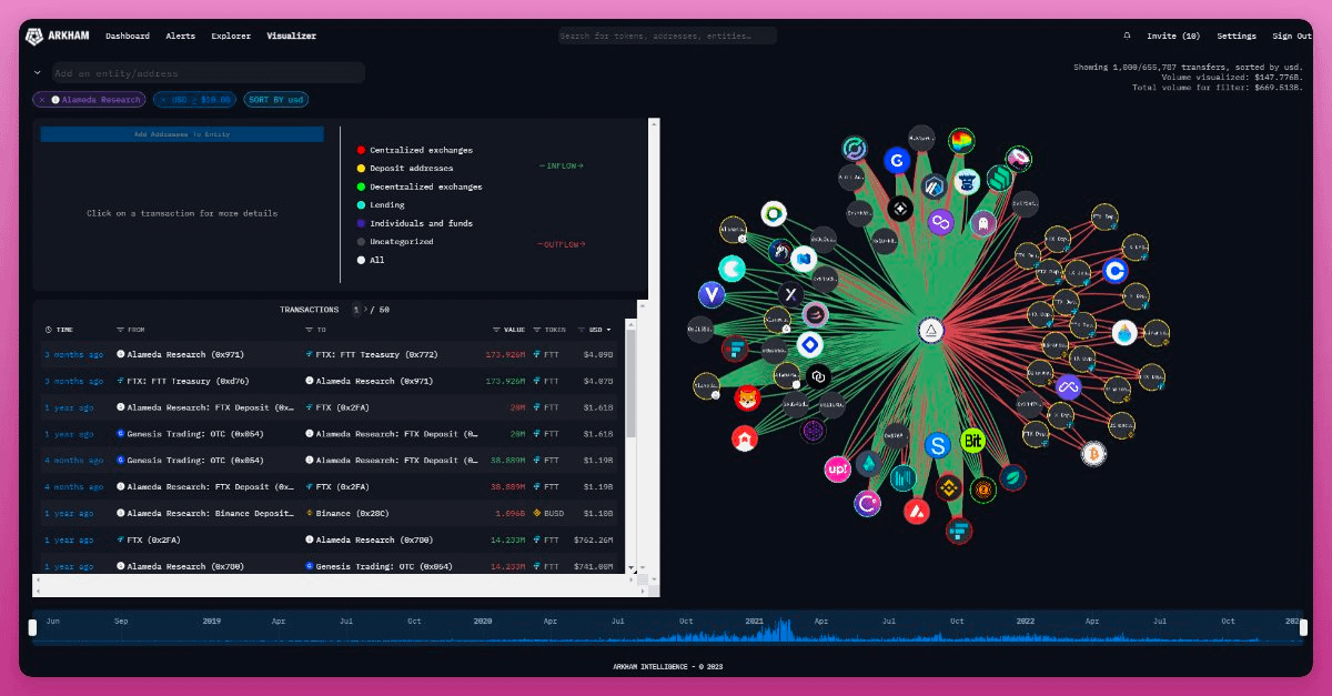 它揭露了鏈上活動背後各個實體組織與企業的活動 下圖是進出 Alameda 錢包交易經過可視化後的結果 可以使用筆者推薦連結省去等候時間: