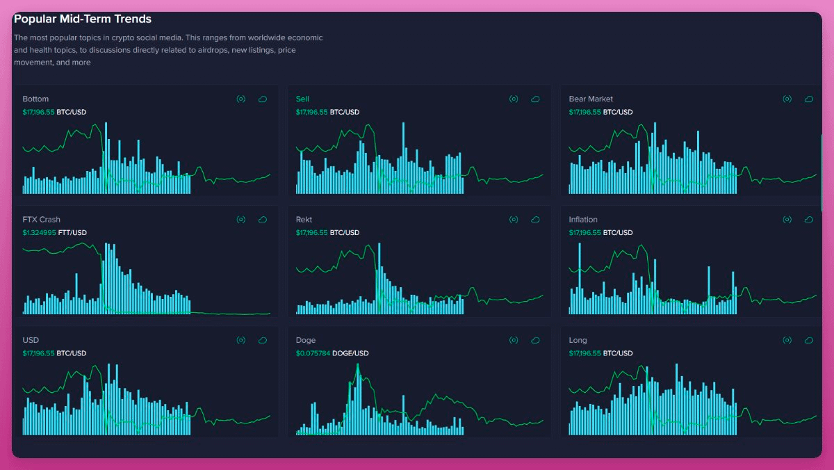 來追蹤鏈上和社交媒體指標。 例如,查看趨勢詞“底部”或“熊市”如何與加密貨幣價格相關聯。 或者實時追蹤 KOL 的 NFT 購買情形