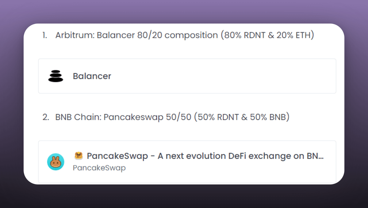 - BNBCHAIN : 50% RDNT / 50% BNB
