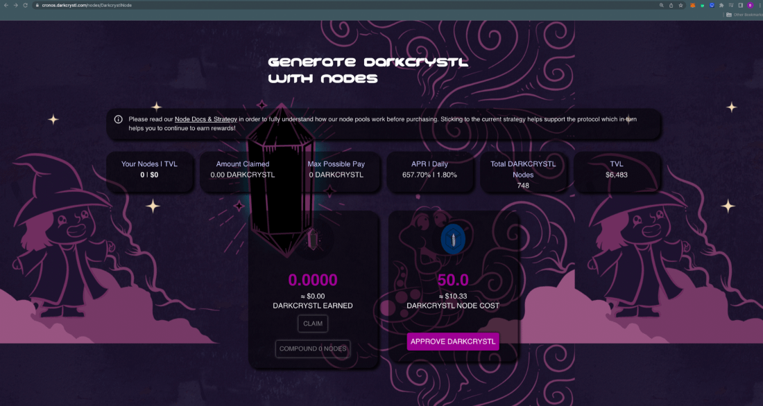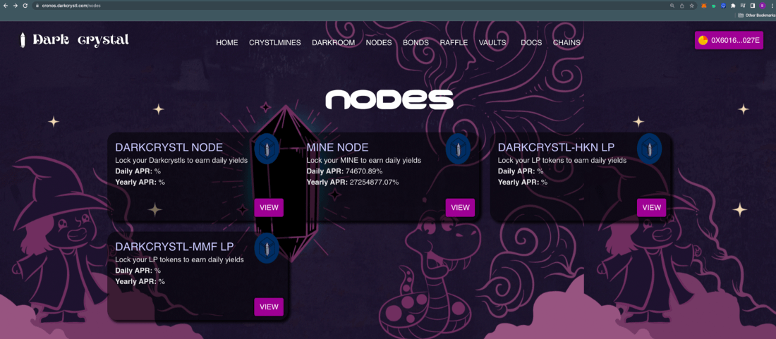 Perfect, we’re almost done. So we already funded our wallet and swapped tokens into the required DARKCRYSTL tokens. As a final step, we head over to the Dark Crystal project website cronos.darkcrystl.com/nodes.