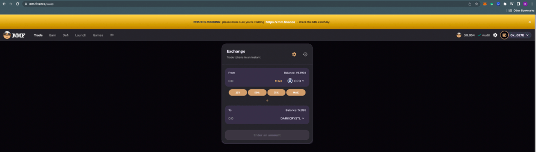 Go to a decentralized exchange as for example mm.finance. Simply select “Trade” — “Exchange,” and afterward, the two tokens as shown below. In case you can’t select DARKCRYSTL, you can input its contract address: 0xEfA1FABC2AB6219174aD1c912F56f7de53cDc1E1.