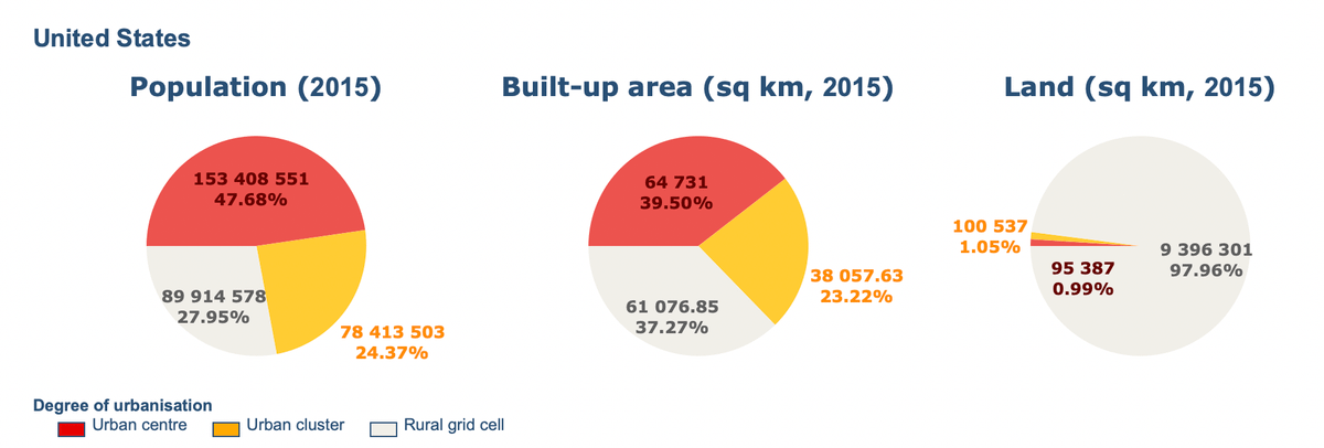 V USA je míra urbanizace ještě vyšší: 48 % obyvatel žije ve městech a další čtvrtina v jejich blízkosti. Jen 28 procent obyvatel bydlí na venkově.