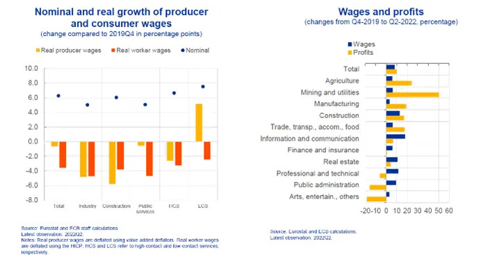Isabel Schnabel z ECB ukazovala, že v EMU „reálné náklady práce deflované cenami výrobců klesly a zisky vzrostly, což naznačuje, že náklady práce v současné době nepřispívají k inflačním tlakům.“