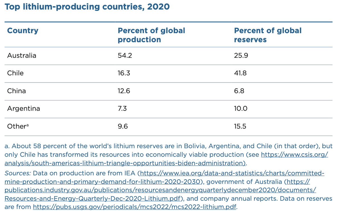 Lithium: více než polovina světové produkce lithia připadá na Austrálii, následuje Chile a Čína. Pokud jde o zásoby tak vede Chile a následuje Austrálie. Řada zemí se aktivně snaží nalézt zásoby lithia na svém území = je pravděpodobné, že čísla budou měnit.