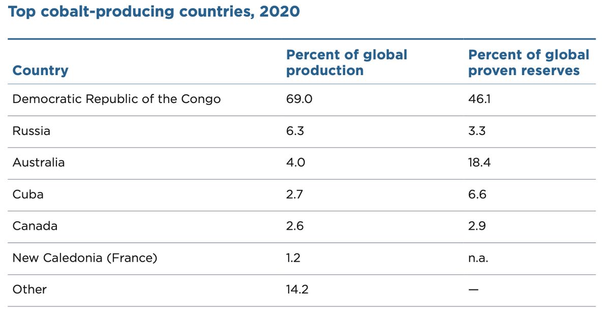 Kobalt: téměř 70% světové produkce se těží v Demokratické republice Kongo. To má i nejvyšší procento celosvětových prokázaných zásob. Na druhém místě v produkci je s velkým odstupem Rusko.