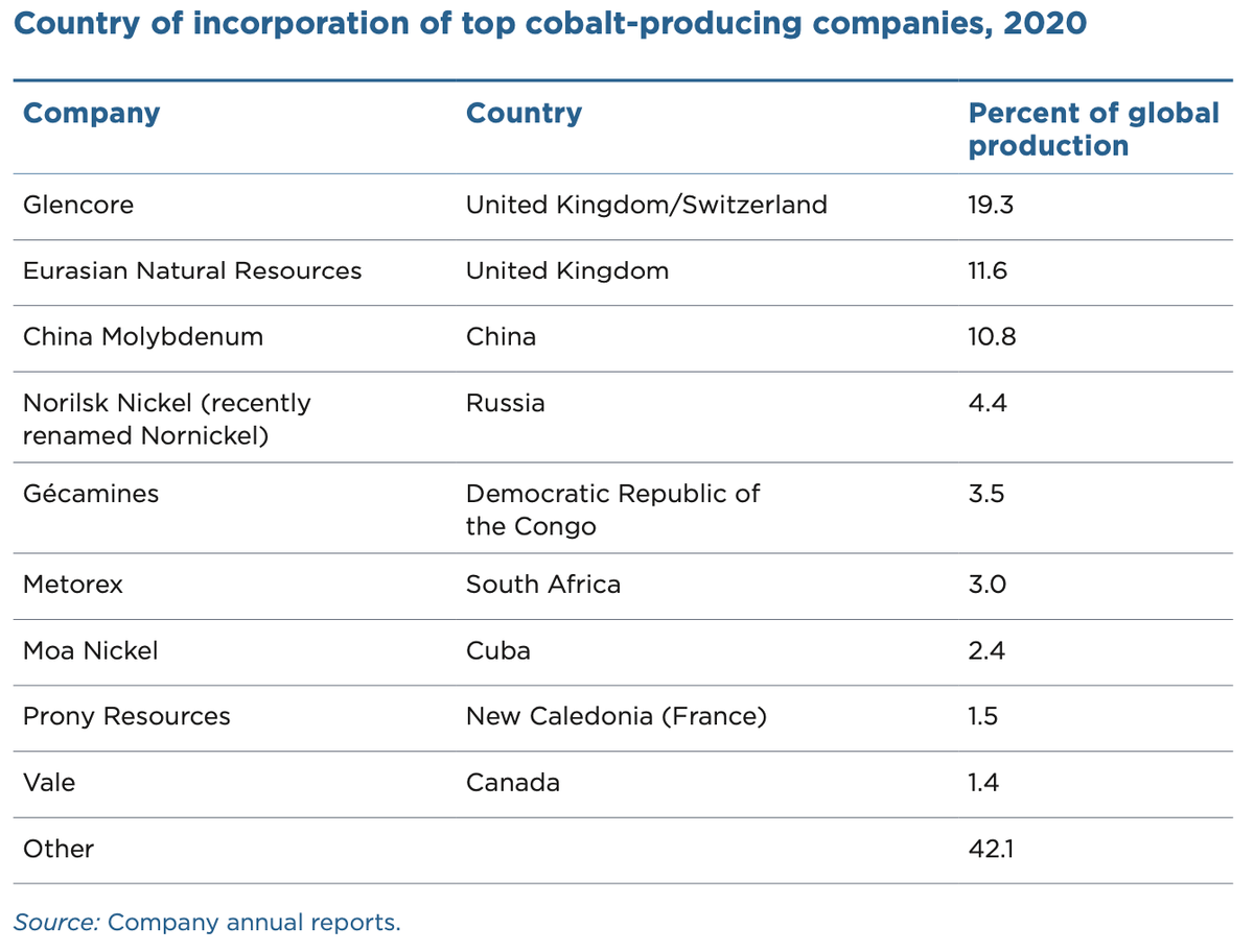 Velký rozdíl je ale v tom, kdo ve skutečnosti těží. Největší producenti jsou registrovaní ve Spojeném království, Švýcarsku a v Číně. Přestože 69 % produkce kobaltu pochází z Demokratické republiky Kongo, firmy zde registrované se podílejí jen 3,5 % na celosvětové produkci.